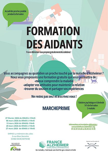 L'association France Alzheimer Gironde et le Centre de Ressources territorial Nord Bassin Océan organisent à partir du 27 février, une nouvelle formation à destination des aidants, qui aura lieu à l'EHPAD La mémoire des ailes, de Marcheprime.