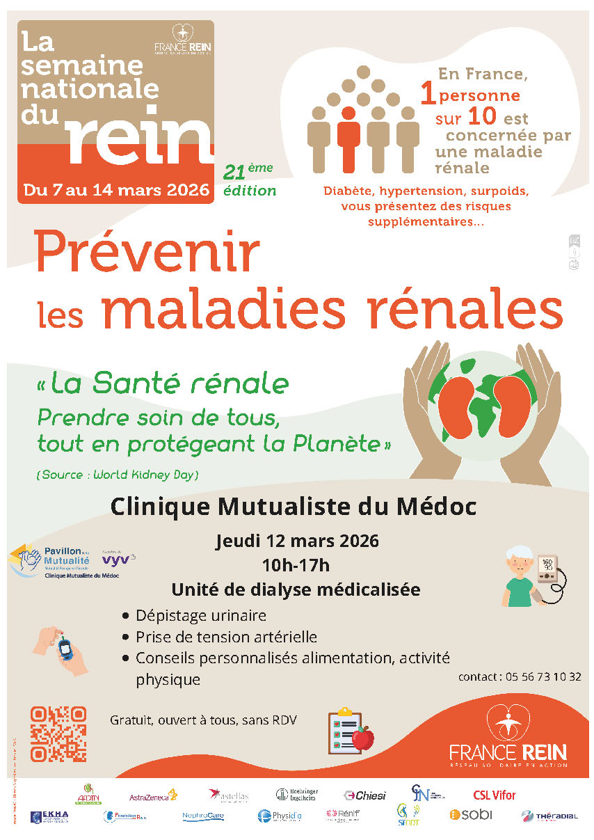 A l'occasion de la Semaine nationale du Rein, l'équipe du service de néphrologie de la Clinique Mutualiste du Médoc en partenariat avec l'association France Rein, vous propose une journée d'informations et dépistage le Jeudi 12 mars 2026 à l'Unité de dialyse médicalisée de l'établissement.