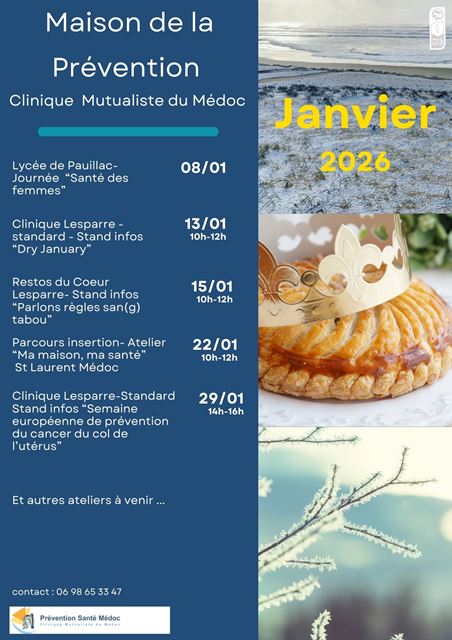En cette nouvelle année, la Maison de la Prévention de la Clinique Mutualiste du Médoc poursuit ses actions de sensibilisation notamment avec un focus sur la santé des femmes, le Dry January ainsi que sur la prévention du cancer du col de l'utérus, à l'occasion de la semaine européenne de prévention de ce type de cancer.
