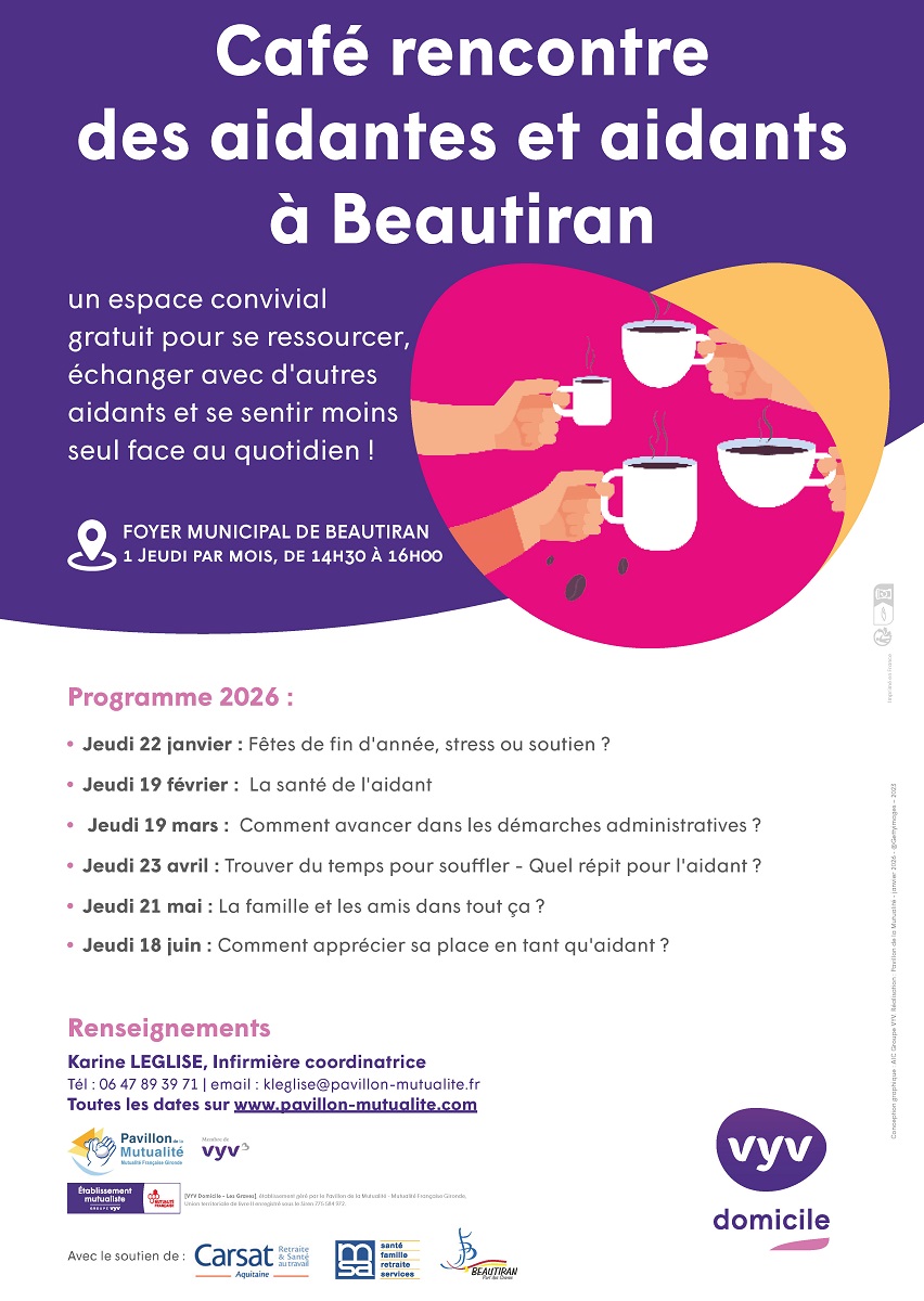 Animé par une psychologue et une infirmière coordinatrice de SSIAD, le Café Rencontre se veut un moment privilégié pour les aidants. Chaque mois, une thématique spécifique sera abordée. Ce dispositif, porté par VYV Domicile Les Graves (SPASAD Les Graves), est totalement gratuit et sans inscription préalable. Il se tient un jeudi par mois jusqu'en juin 2026, de 14h30 à 16h00, à Beautiran.
