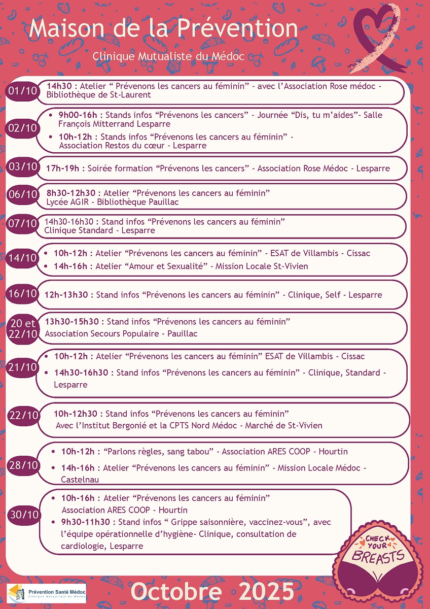 En octobre, la Maison de la Prévention de la Clinique Mutualiste du Médoc poursuit ses actions de sensibilisation notamment en faveur de la santé des femmes avec un focus sur la campagne d'Octobre rose, mois de lutte contre le cancer du sein.