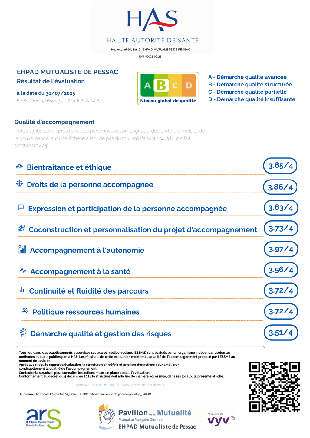 Nous sommes fiers d'avoir obtenu le niveau B - Démarche Qualité Structurée, car c'est une étape importante qui confirme la solidité de nos pratiques, l'implication de nos équipes et la qualité de l’accompagnement proposé aux résidents.